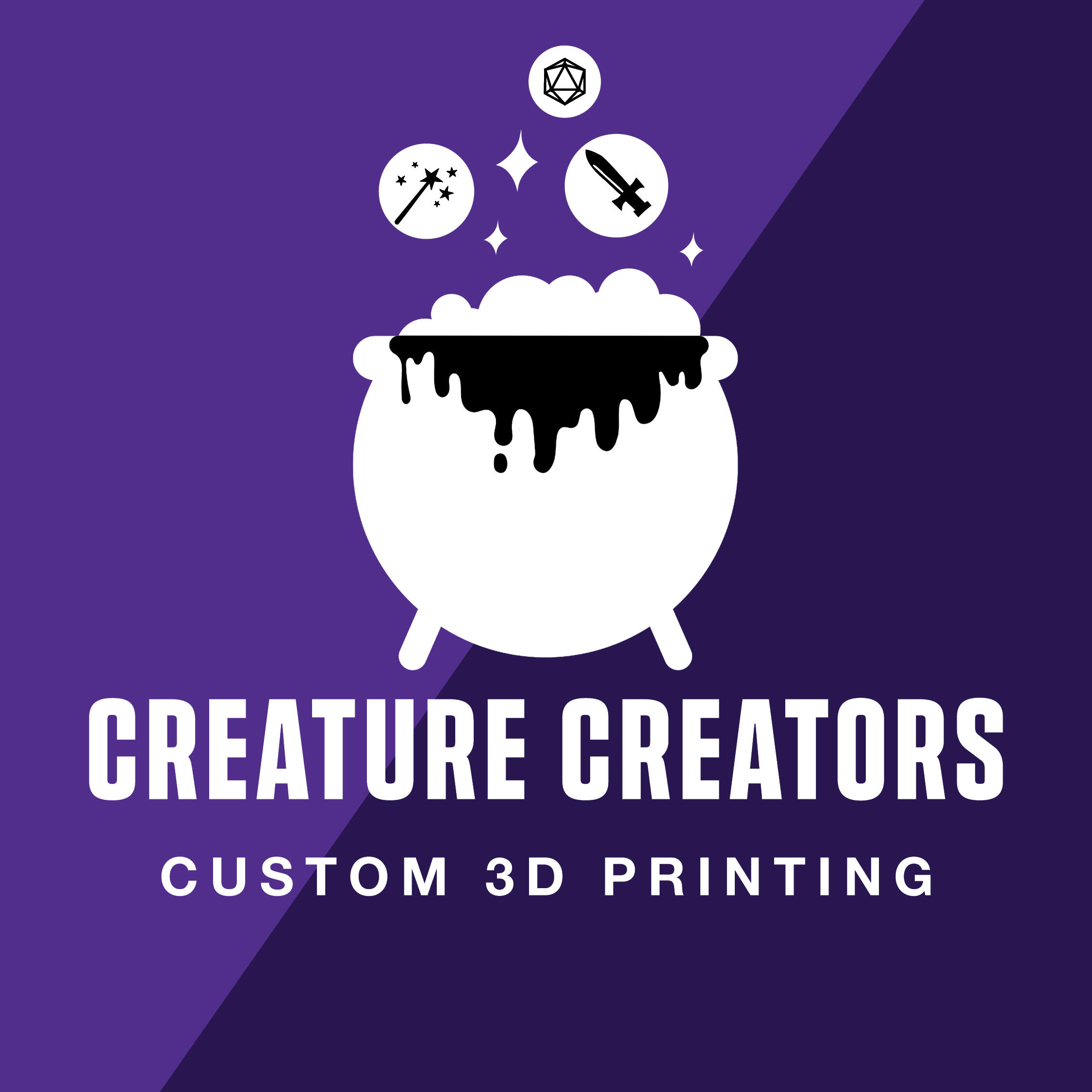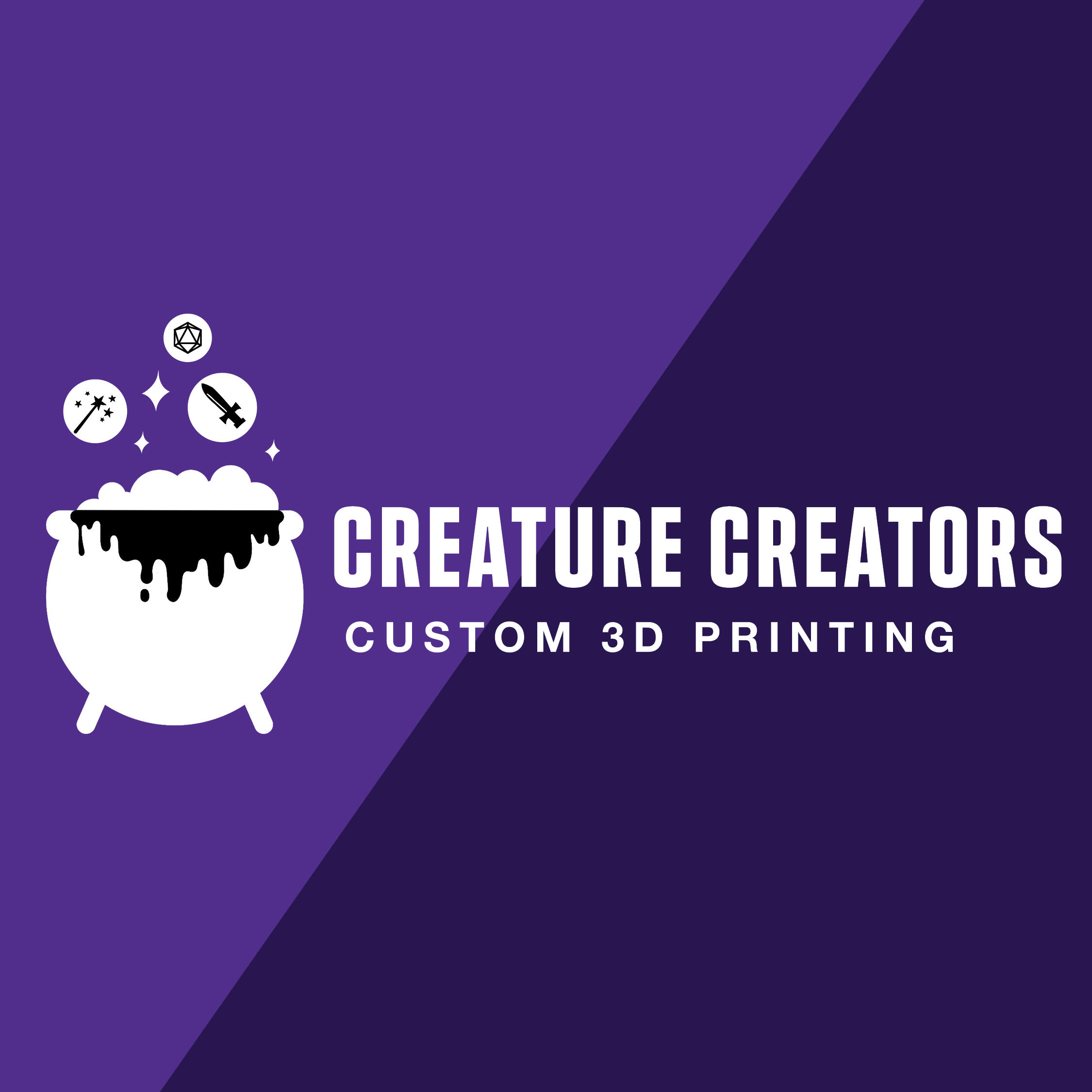 The Creature Creators logo features a cauldron bubbling with creations from magic to weapons and armor from fantasy and the media realms. The logo encompasses many facets of what is possible with Creator Creators 3D Printing.